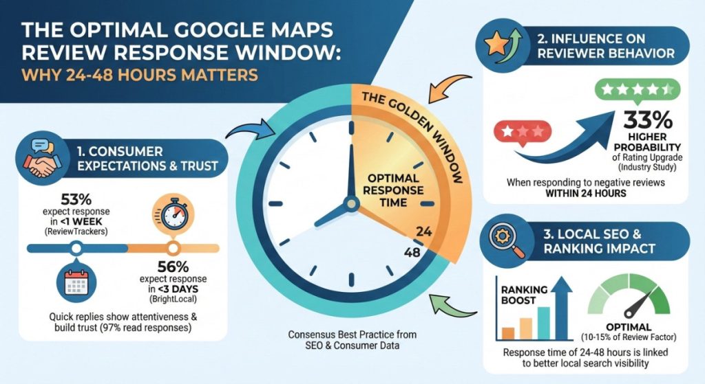 With this guide, you'll understand why strategic speed and consistent presence are the best way to build a positive business image and increase traffic and conversions from Google Maps, rather than blindly following anecdotal time limits.