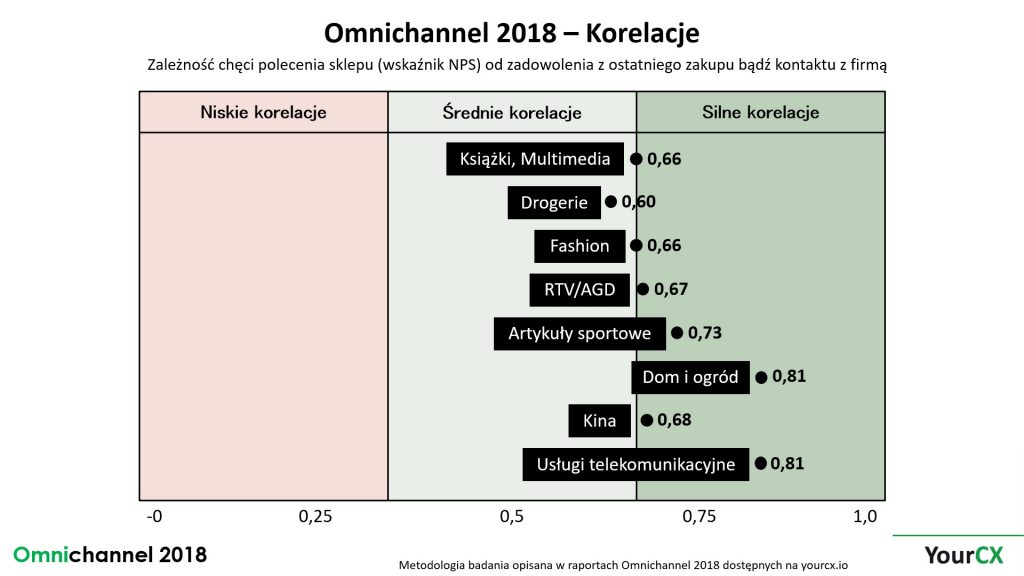 Jak widać powyżej, w branży "Dom i ogród" oraz "Usługi telekomunikacyjne" notujemy bardzo silne korelacje wskazujące na bezpośrednią zależność chęci polecenia od zadowolenia, stopnia osiągnięcia celu oraz łatwości zakupu. Oznacza to, że Klienci firm telekomunikacyjnych oraz konsumenci kupujący artykuły do domu i ogrodu chęć polecenia marki znajomym mocno uzależniają od zadowolenia z procesu zakupu oraz jakości usług. Szansa polecenia marki ma duży wpływ na dalszą sprzedaż, nawet rzędu kilku punktów procentowych przy zmianie NPS o 5.